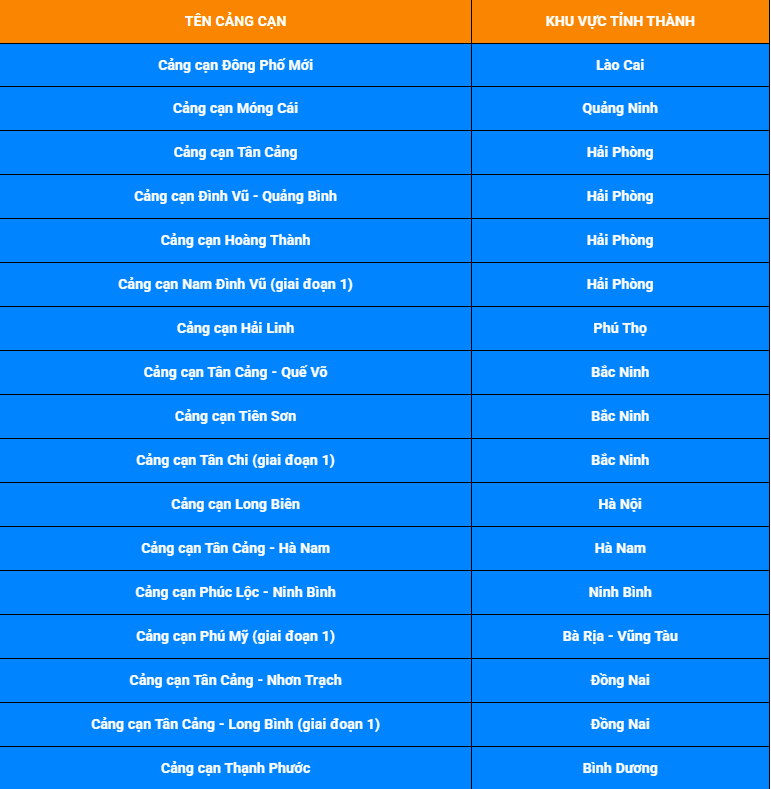 Hiện tại, Việt Nam đang sở hữu khoảng 17 cảng cạn lớn nhỏ khác nhau, phân bố tại nhiều tỉnh thành từ Bắc đến Nam. Bạn đọc có thể tham khảo chi tiết Danh mục cảng cạn Việt Nam dưới đây: